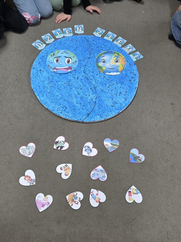 W dniu 22 kwietnia obchodziliśmy w naszym przedszkolu Światowy Dzień Ziemi. Dzieci miały okazję porozmawiać o tym co sprawia, że Ziemia jest smutna (zanieczyszczona) oraz co możemy zrobić dla Ziemi, aby była szczęśliwa (czysta). Przedszkolaki poznały zasady, których należy przestrzegać, aby chronić środowisko, uczyły się poprawnego segregowania śmieci oraz poznały