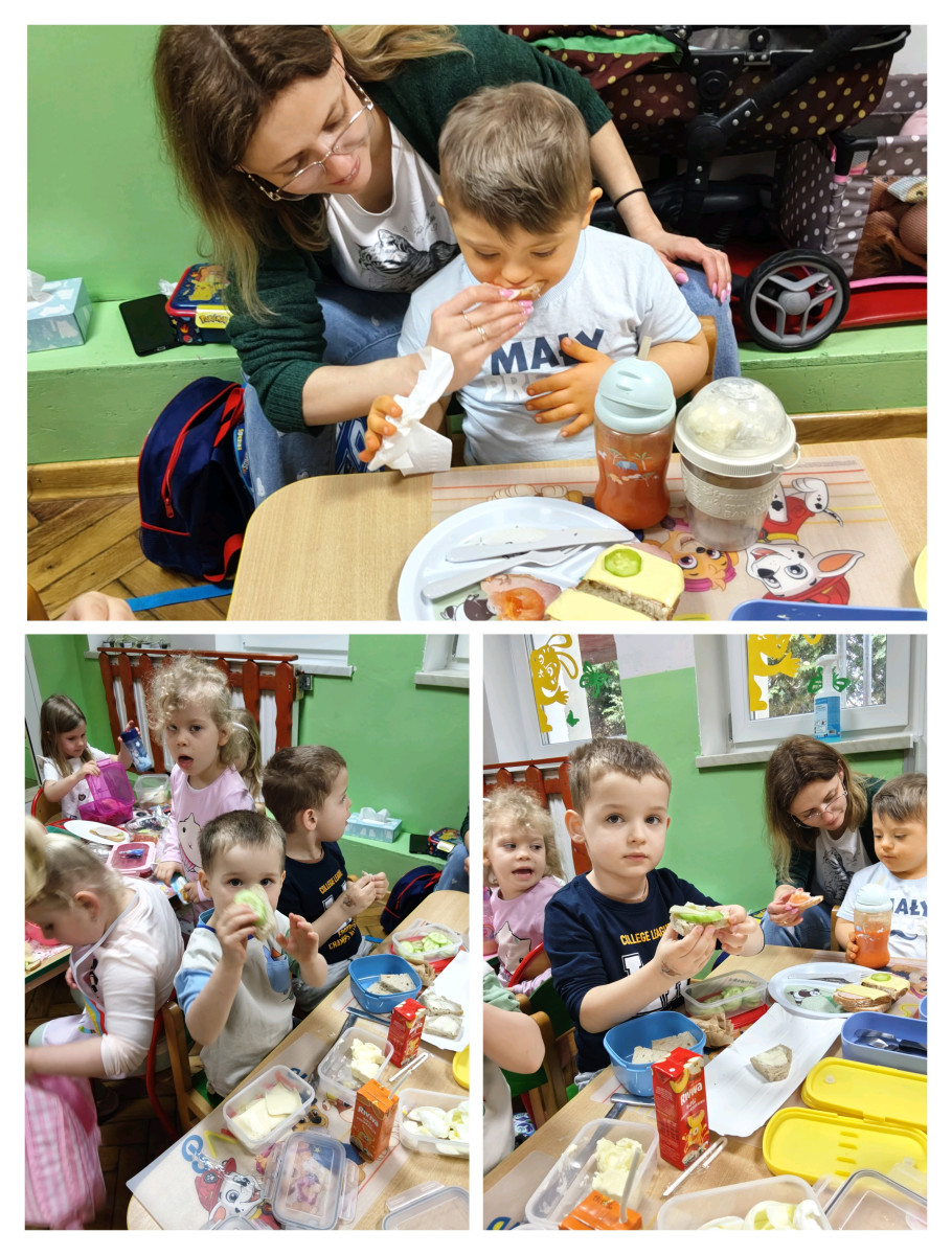 W dniu 13.04.2026 r. dzieci w oddziałach przedszkolnych przygotowały pyszne, zdrowe kanapki. Na stole nie zabrakło sera, pomidorów, ogórków, papryki i innych zdrowych składników. Dzieci po starannym umyciu rąk z zaangażowaniem przystąpiły do pracy. Kanapki nie tylko były smaczne, zdrowe ale i pięknie ozdobione. Po skończonej pracy wszyscy z apetytem zjedliśmy przygotowane kanapki.